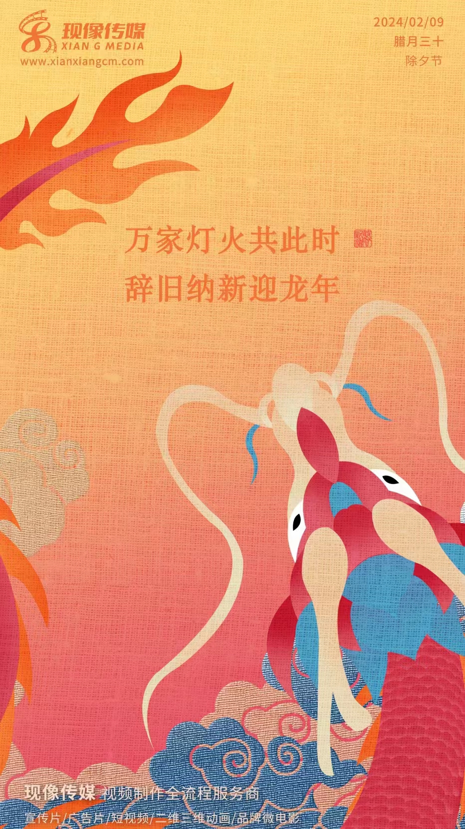 現像傳媒祝大家新年快樂 作者:admin | 時間:2024-03-06 18:58:44 萬家燈火共此時 辭舊納新迎龍年 現像傳媒祝您在新的一年里 龍騰萬里 乘風而起 萬事勝意 八方來財 ,現像傳媒祝大家新年快樂